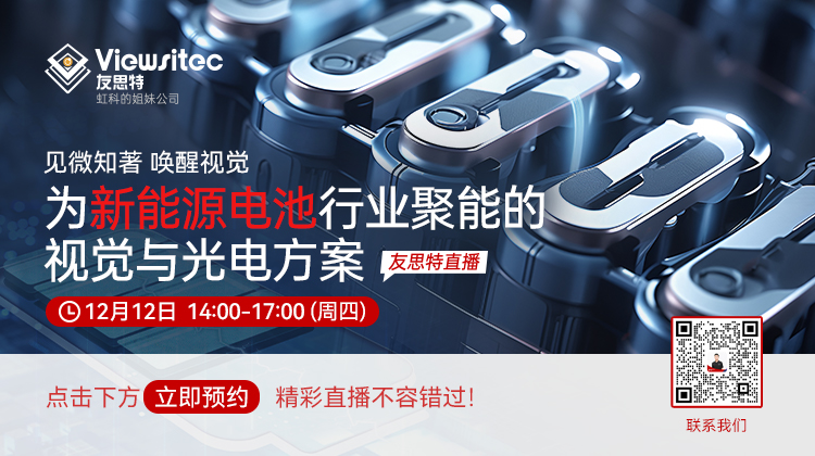 在全球多国大力发展新能源汽车及能源替代的大背景下,锂电池市场出货量持续高速增长,随着新能源/储能行业高度景气,高产量的需求也倒逼着高质量的产品。机器视觉与光电技术是锂电生产中最高效的质量控制方法,无损智慧的检测方案大大降低了检测成本,还能保证锂电池的出厂质量,维护新能源行业的健康发展。 友思特聚焦新能源锂电检测应用,推出“为新能源电池行业聚能的视觉与光电方案”系列直播,分享先进的视觉与光电技术,探索友思特方案赋能锂电生产实际应用。诚邀您“见微知著 唤醒视觉”,探索为新能源电池行业加码聚能的优质解决方案!